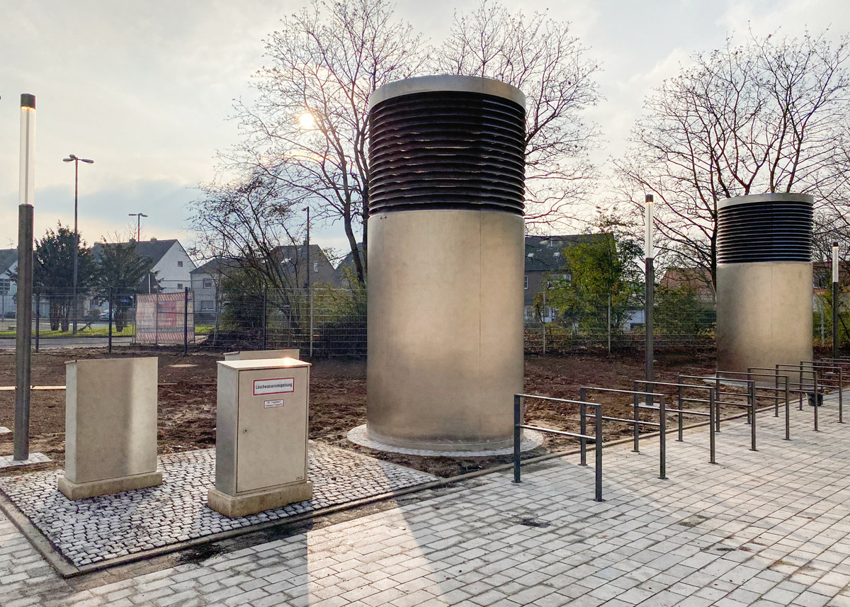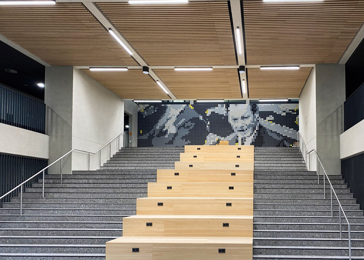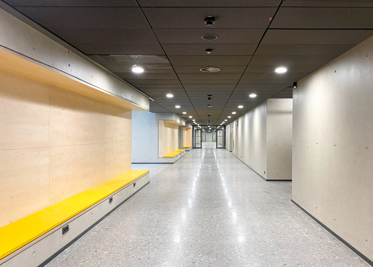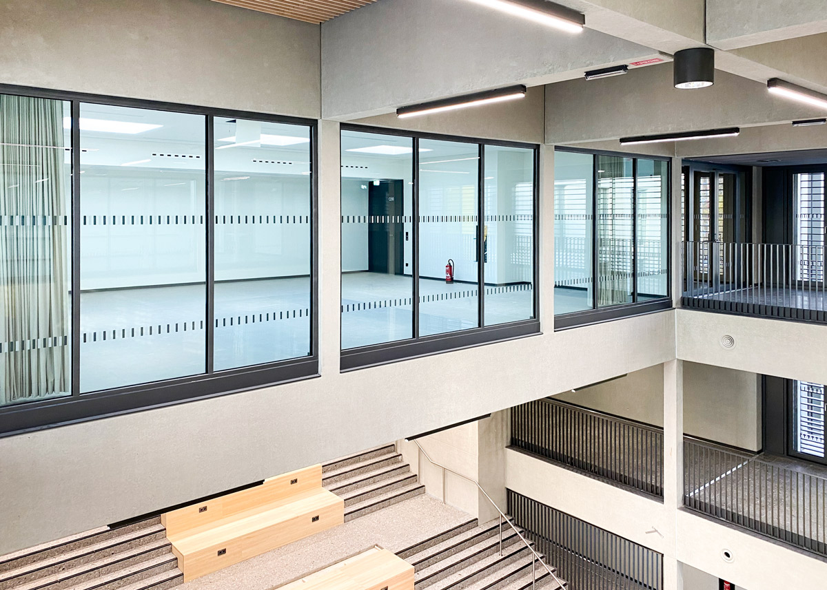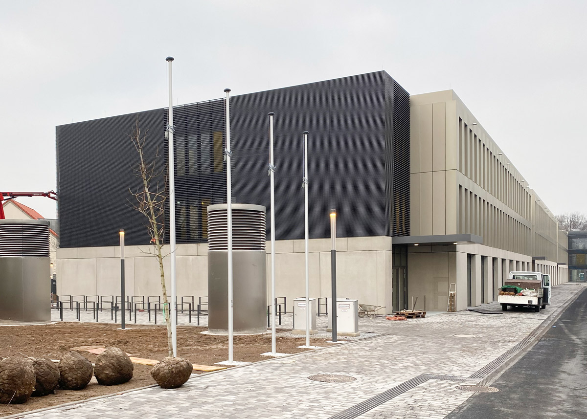 Der Neubau des Schulgebäudes wird ein ca. 180m langer und 28m breiter (ca. 23000m² BGF), dreigeschossiger Gebäuderiegel (EG, 1.OG und 2.OG). Der Gebäuderiegel wird in vier sogenannte Cluster unterteilt. An der Ostseite schließt das ebenfalls dreigeschossige, recht-eckige Hauptgebäude an. Im Hauptgebäude befinden sich die Räumlichkeiten zur Verwaltung, ein Mensabereich und ein Pädagogisches Zentrum. Das Hauptgebäude wird mit dem Gebäuderiegel mittels einem offenen Forums-bereiches, welche gleichzeitig den Haupteingang ausbildet, verbunden. Die Schule wird in Passivhausstandard errichtet.